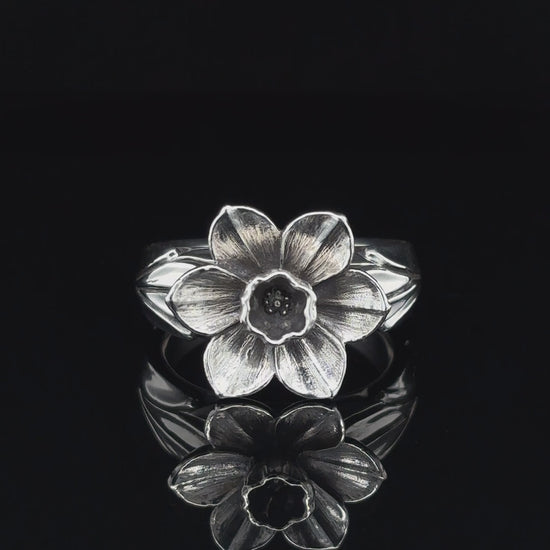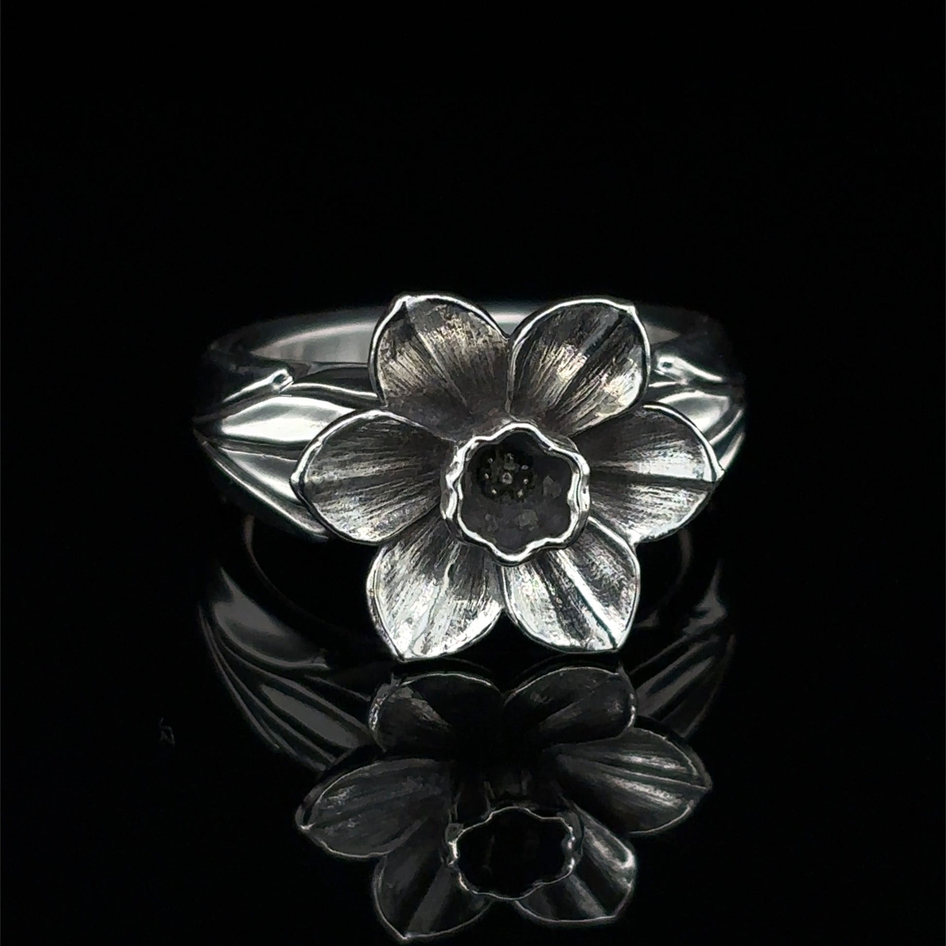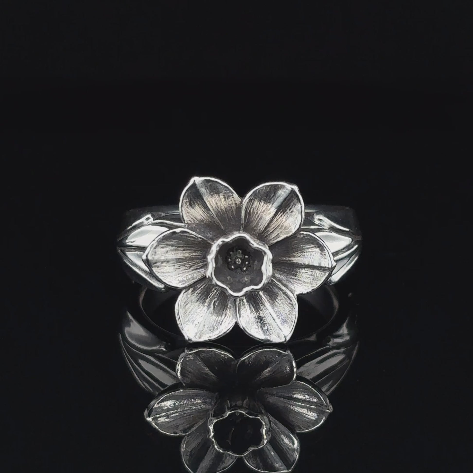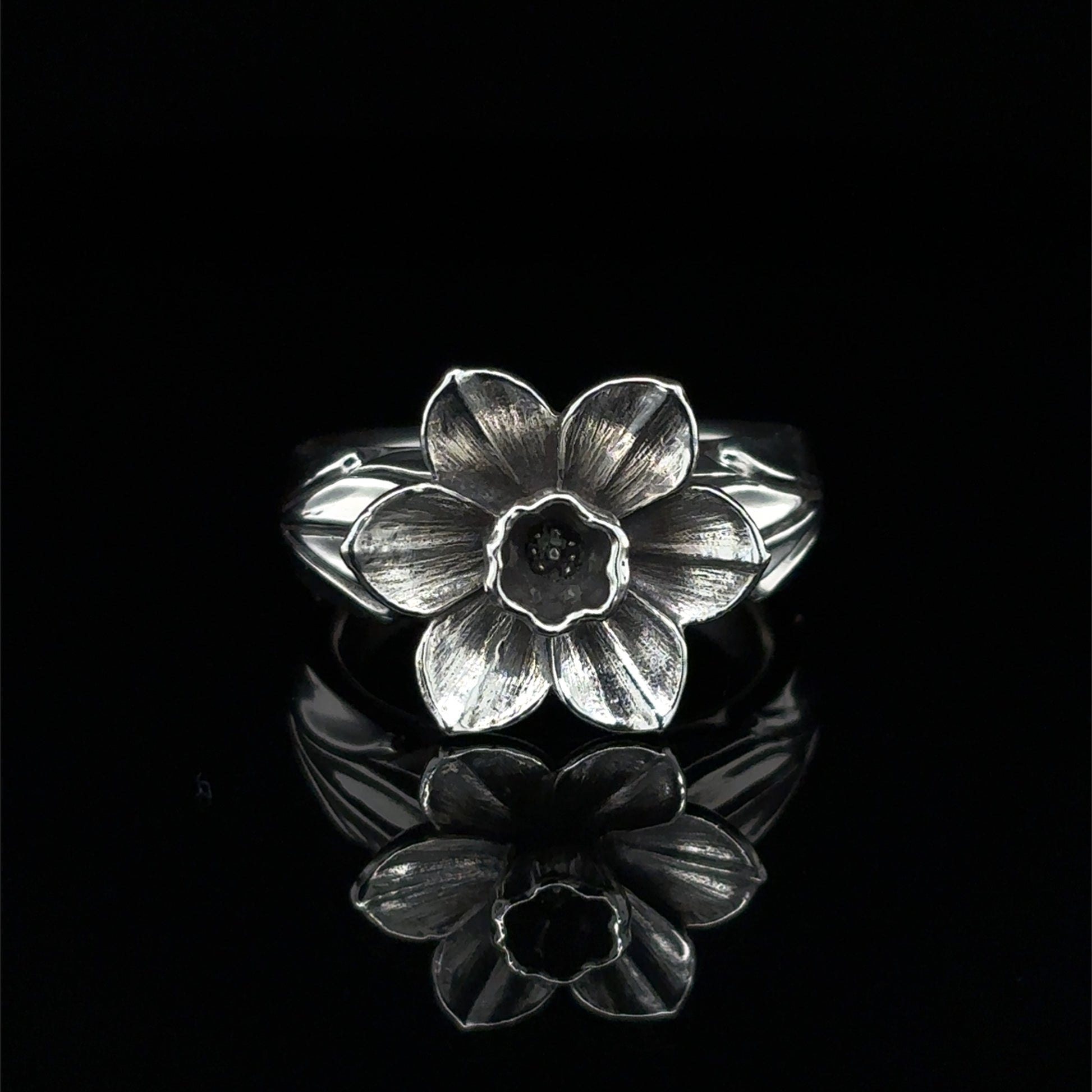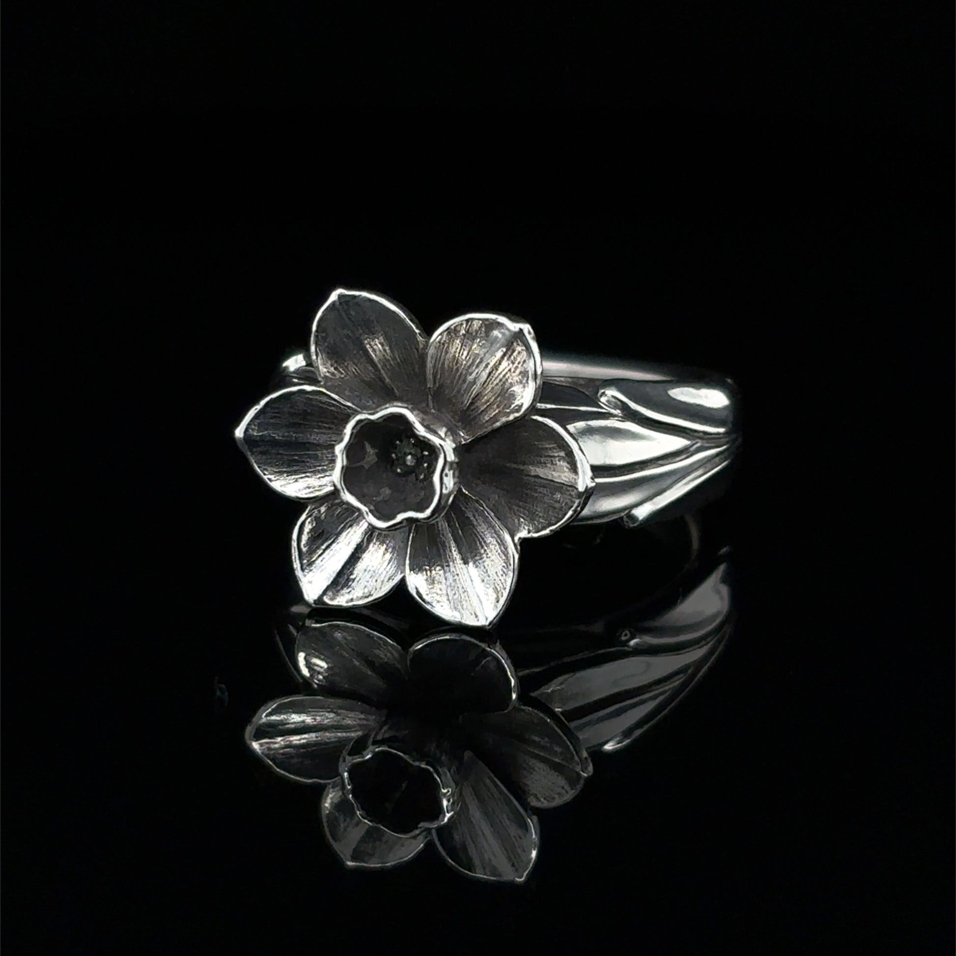 This beautiful sterling silver ring represents a daffodil flower. The side of the band have leaves just like the shape of real leaves. The floral ring is hand carved with immaculate detail to realistically represent a daffodil. Inner lip inside the ring gives this piece and nicely framed and finished look.
