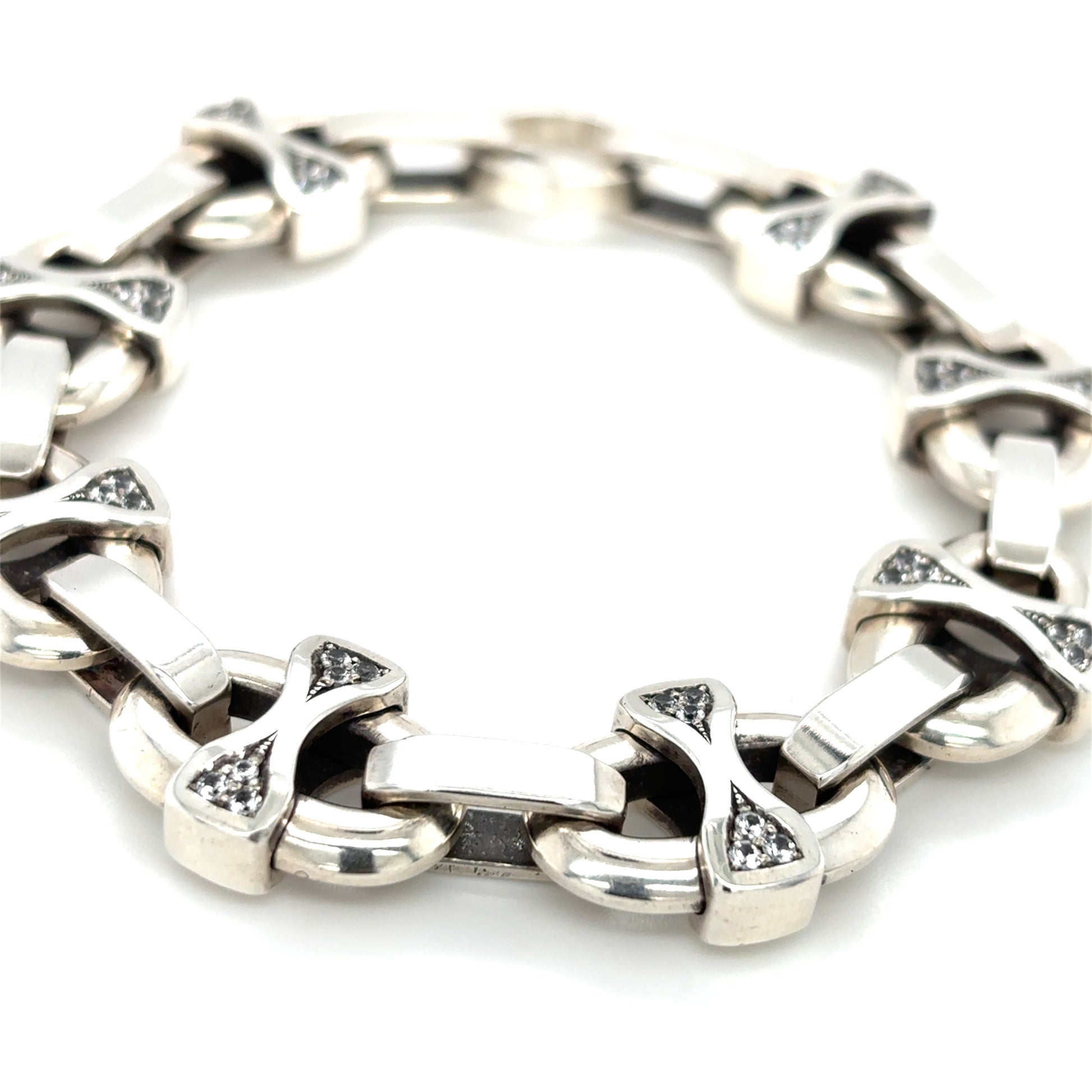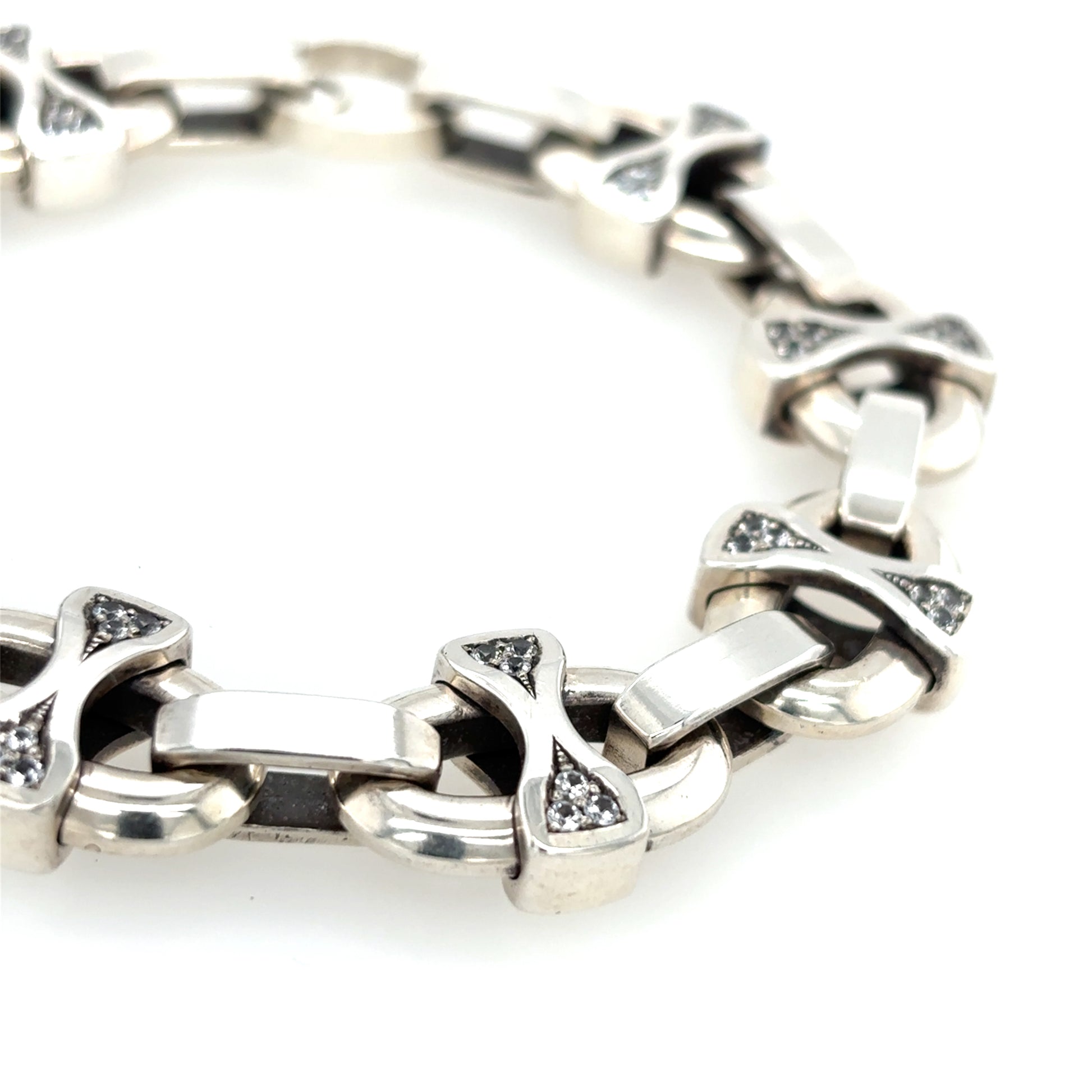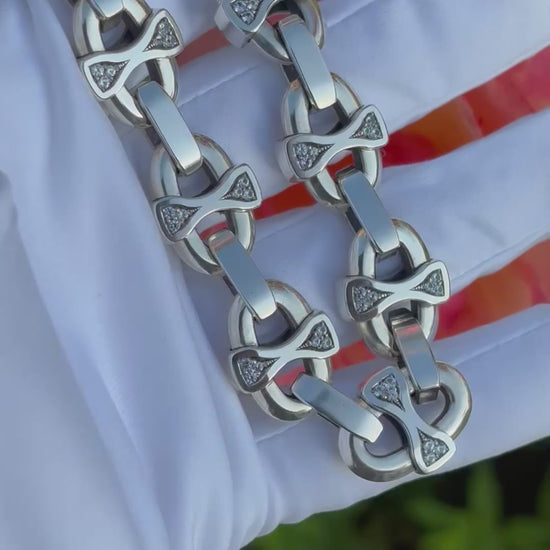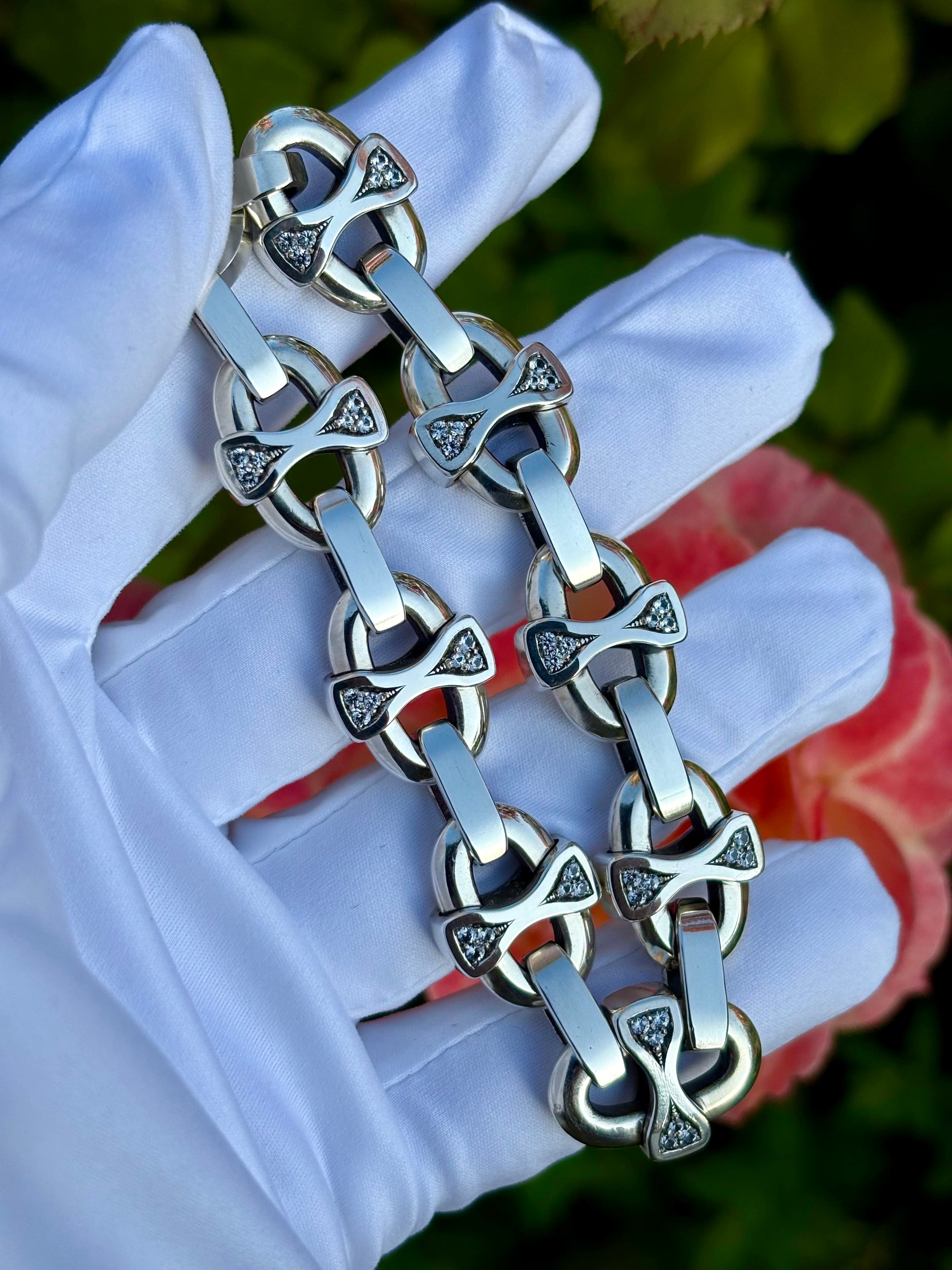 This chunky silver link bracelet is completely hand carved, cast and hand assembled in house, featuring natural AA grade white sapphires set into every link crossbar. This design is totally original, no others just like it out there. This thick bracelet is inspired by nautical or mariner style chains, with its own unique look. The sterling silver is comprised of de-ox, tarnish resistant silver with no copper in it, very resistant to tarnishing, so it will stay nice and shiny. This piece of jewelry is truly one of kind for that connoisseur jewelry collector.