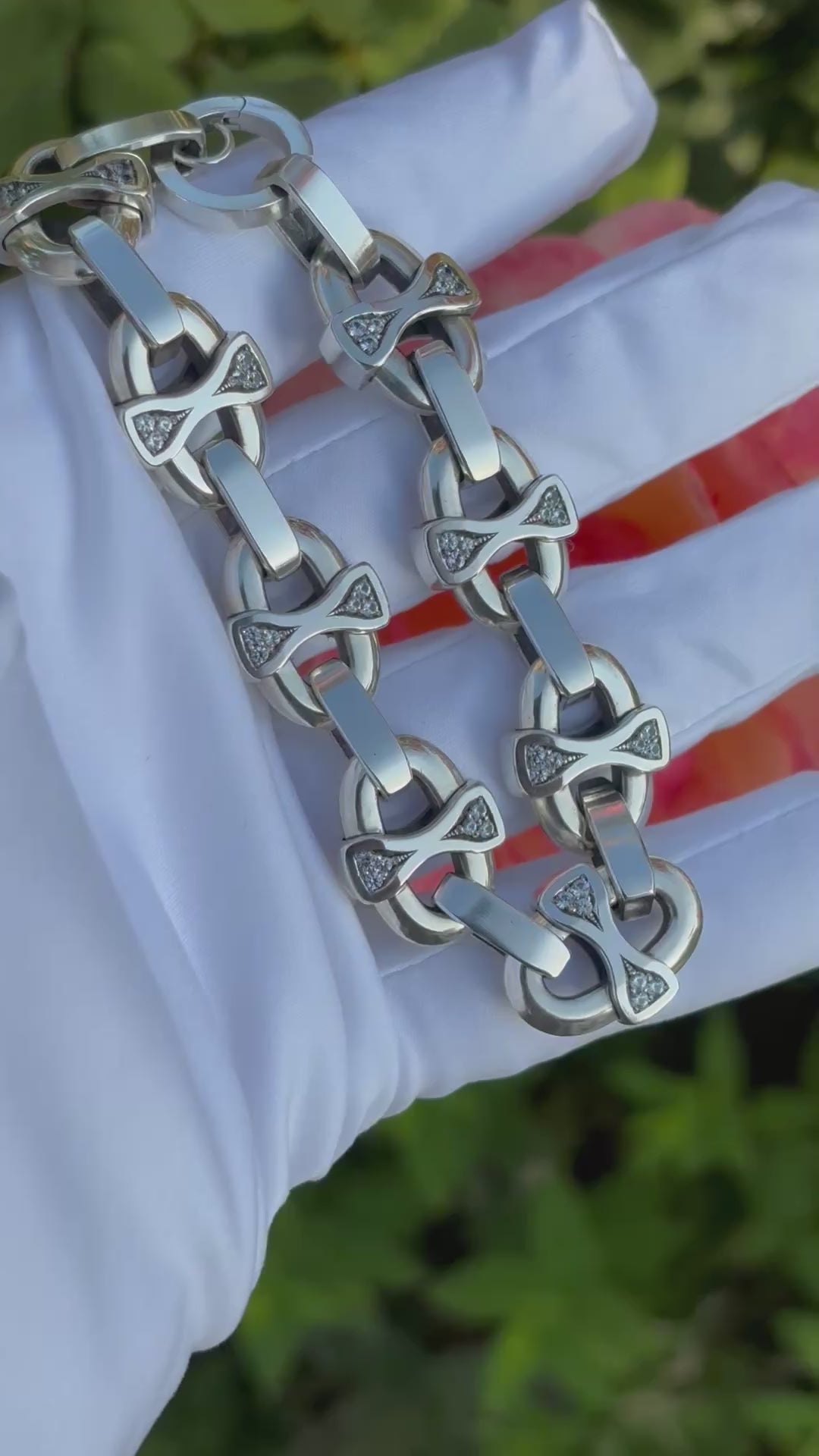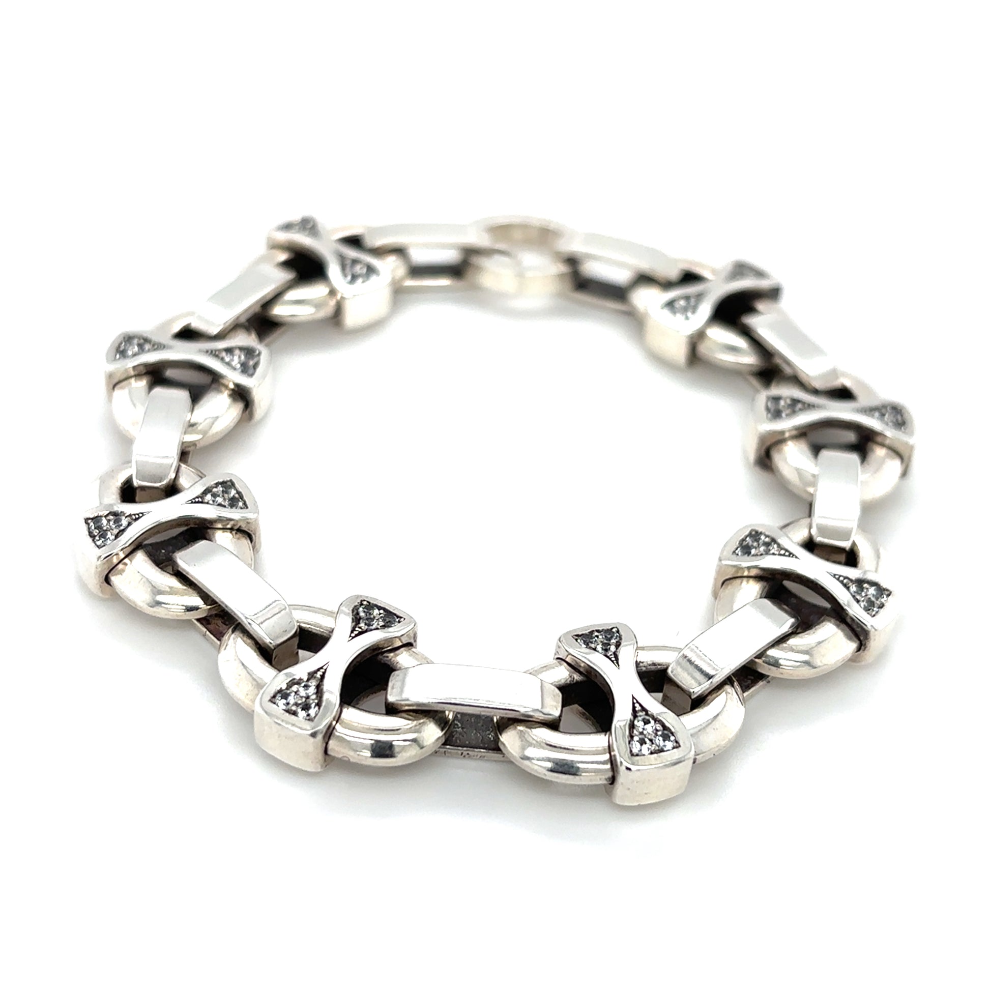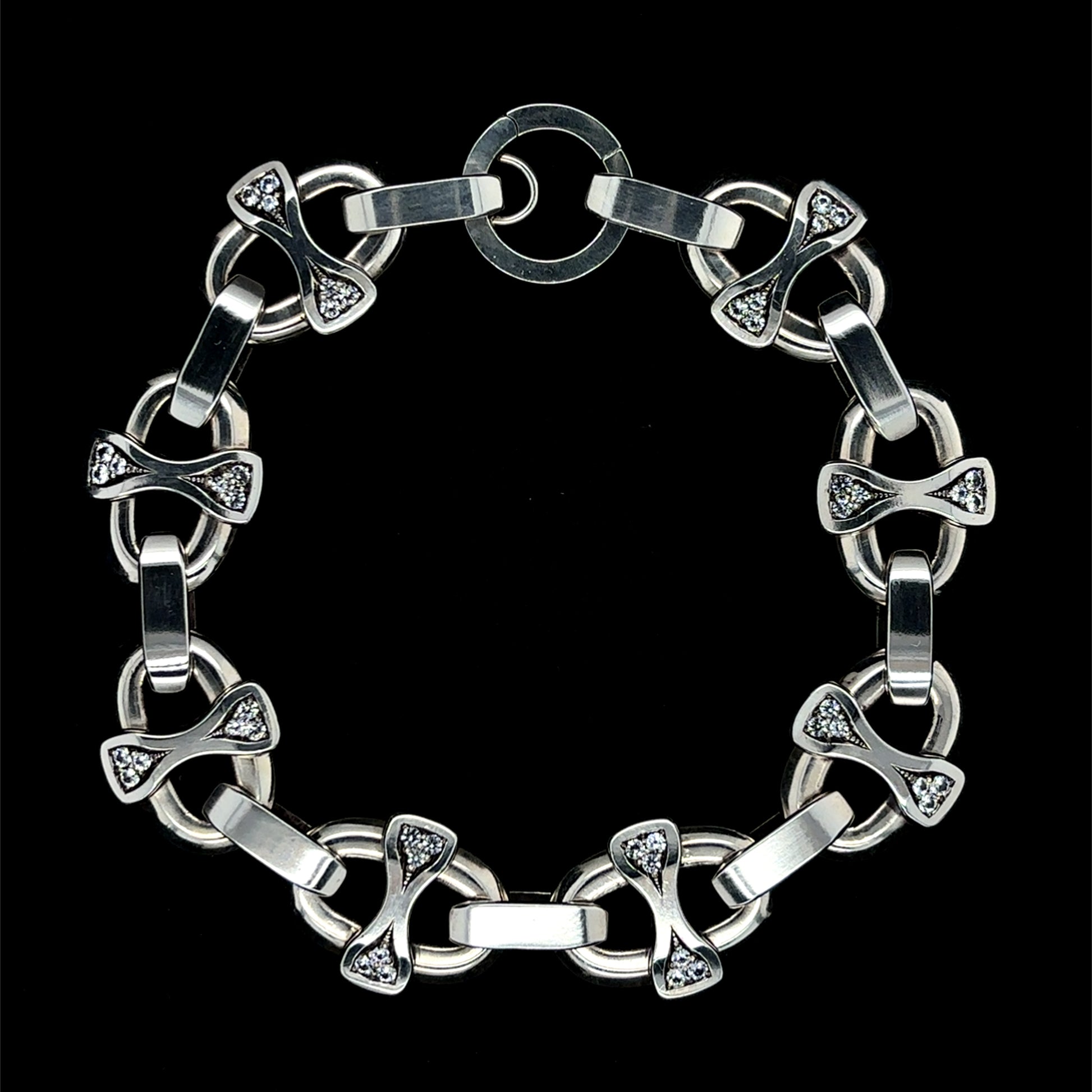 This chunky silver link bracelet is completely hand carved, cast and hand assembled in house, featuring natural AA grade white sapphires set into every link crossbar. This design is totally original, no others just like it out there. This thick bracelet is inspired by nautical or mariner style chains, with its own unique look. The sterling silver is comprised of de-ox, tarnish resistant silver with no copper in it, very resistant to tarnishing, so it will stay nice and shiny. This piece of jewelry is truly one of kind for that connoisseur jewelry collector.